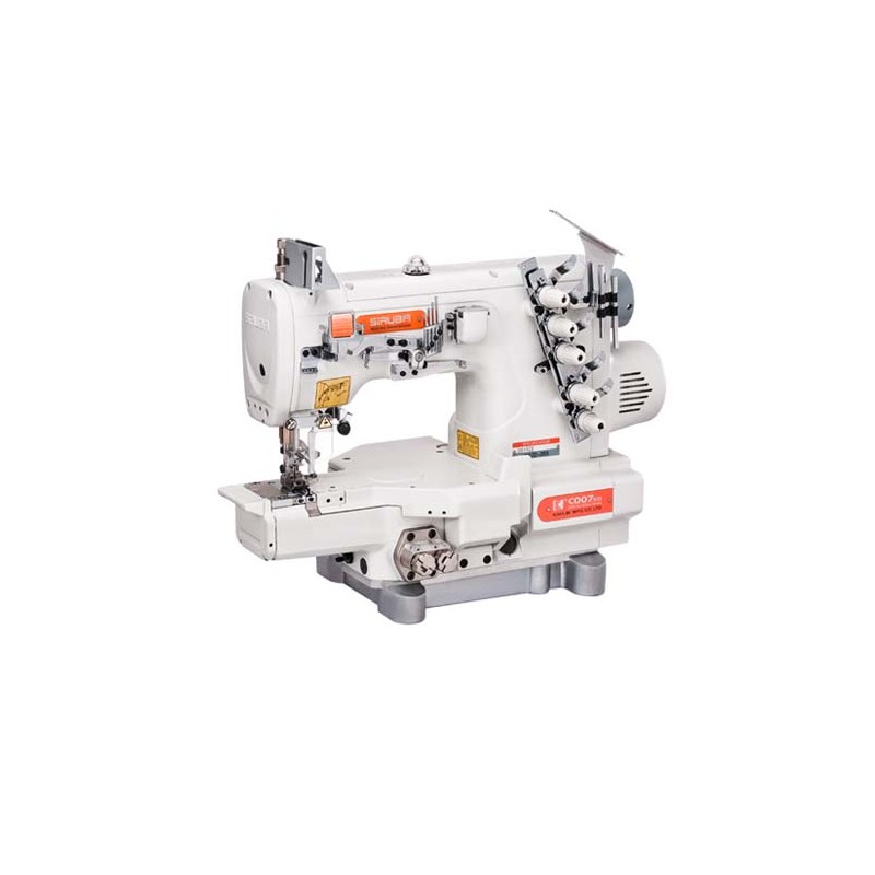Siruba С007K-W122-356CH - 3-игл, 5 нит. интерлок с верхним укладчиком, цилиндрическая платформа, расстояние между иглами 5,6 мм, длина стежка 1,4-3,6мм, дифференциал до 2,9 мм, подъем лапки 5,0мм, скорость 6000 об/мин.