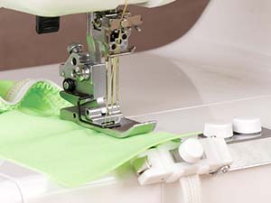 Положите резинку ближе к направителю с правой стороны, закройте защёлку и с помощью винта на защёлке отрегулируйте натяжение резинки /величину посадки ткани. Отрегулируйте натяжение игольных нитей и нити петлителя. Сделайте несколько стежков на резинке, затем сверху положите ткань и продолжайте работу. Резинка должна растягиваться, а на ткани образуется равномерная сборка.