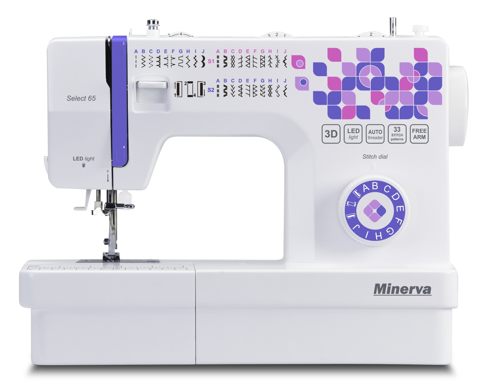 Minerva Select 65 - электромеханическая швейная машинка для работы практически со всеми видами тканей. Модель станет незаменимой помощницей, как в домашнем пользовании, так и в маленьких ателье. Select 65 выполняет 33 вида различных строчек, среди которых рабочие, оверлочные, декоративные и эластичная строчка для работы с трикотажем. Петля выметывается в режиме полуавтомат за 4 этапа без проворачивания ткани. Для удобства переключения строчек на корпусе модели установлен вращающийся диск.